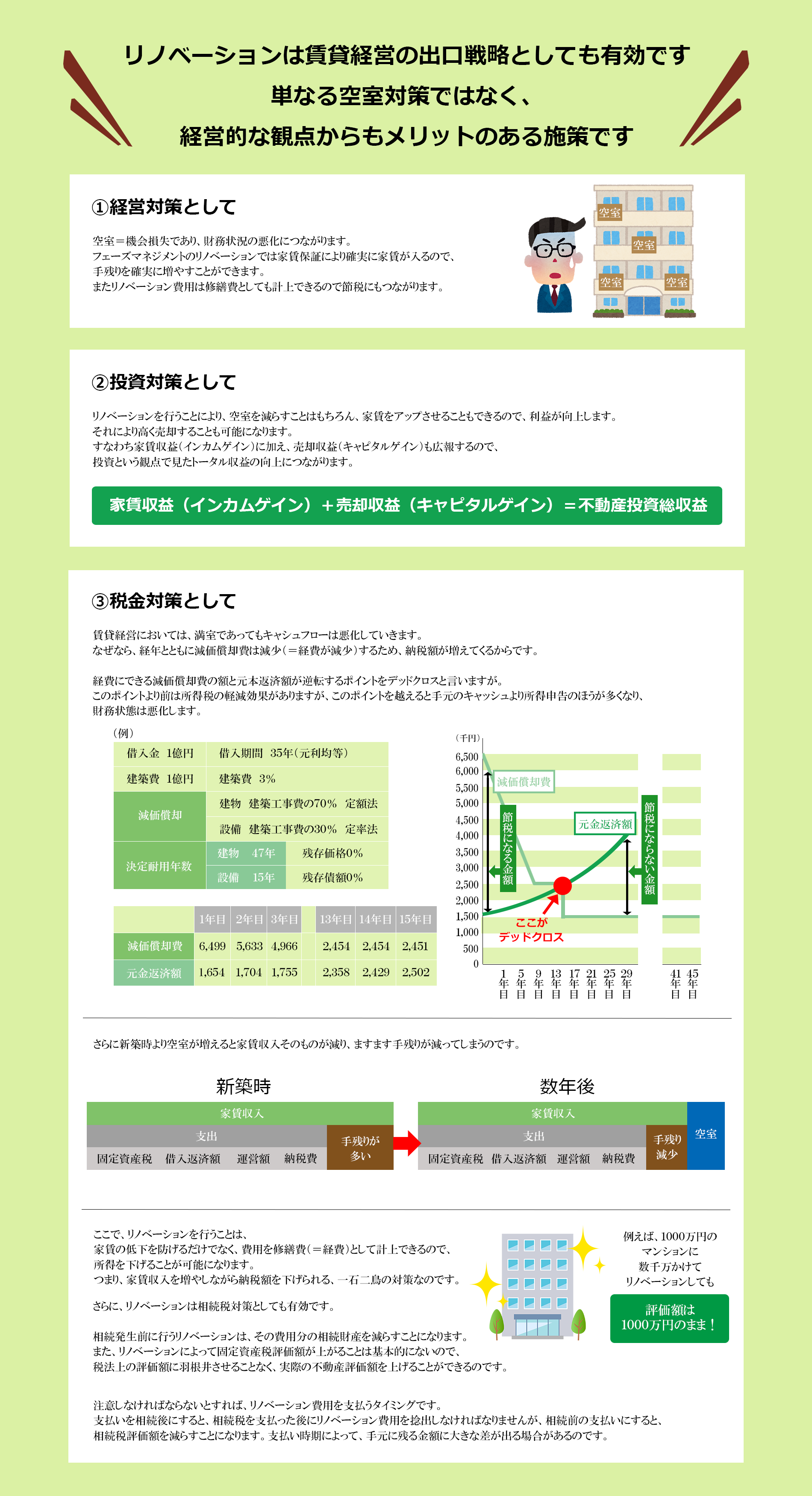 リノベーションは表装的な工事になるので、減価償却でなく単年度償却が可能です。
