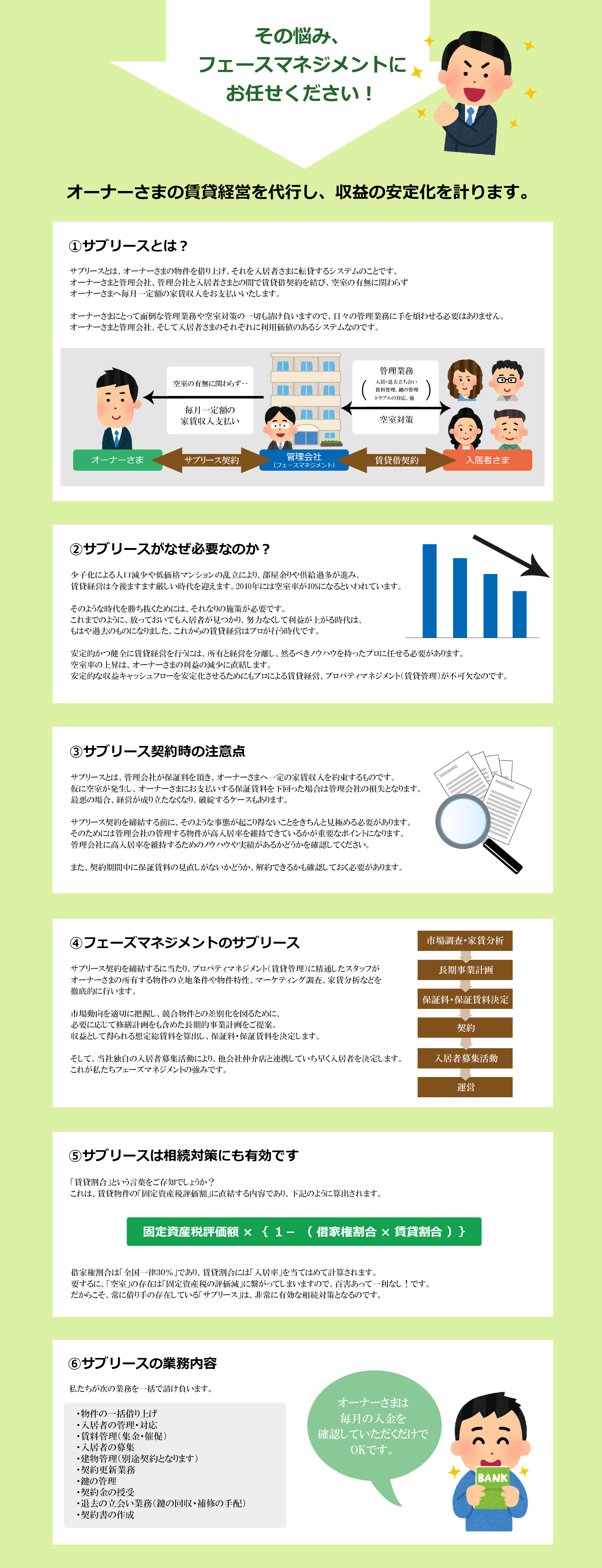 サブリースとは、オーナーさまの所有物件をまるごと借り上げて運営を代行する業務形態になります。