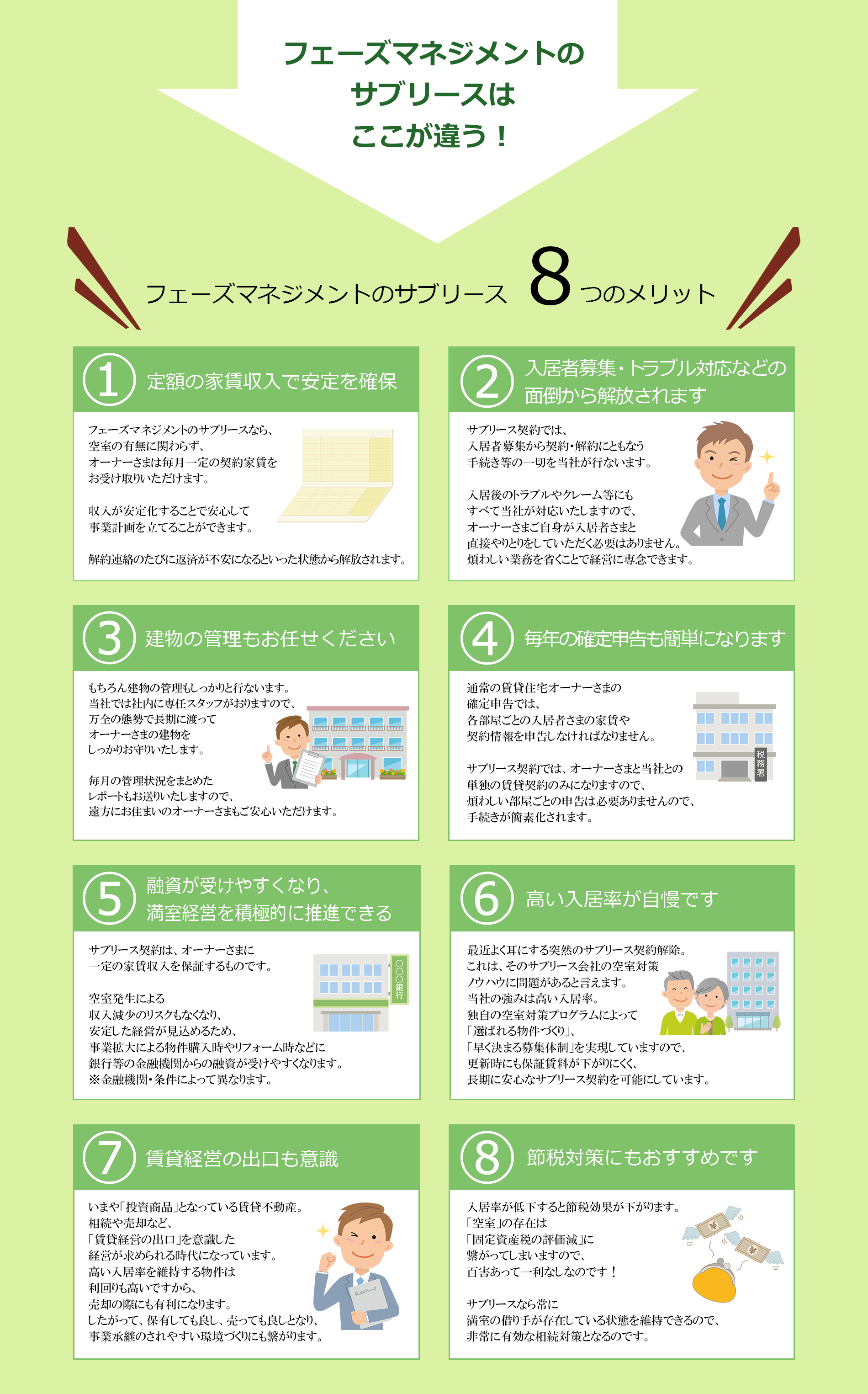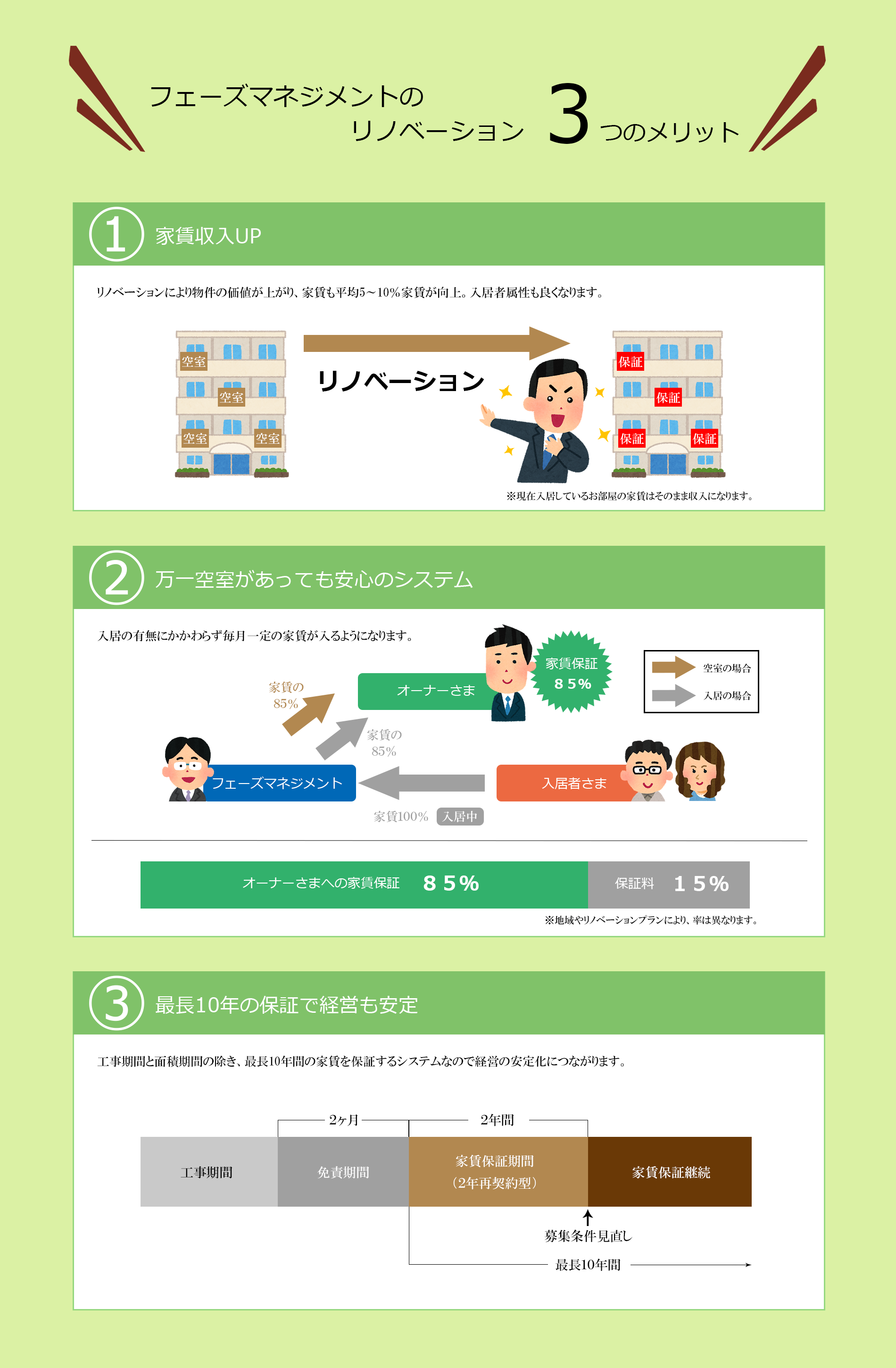 入居者獲得には絶対的な自信がありますので、家賃収入が滞る心配がないため、家賃保証が可能となります。